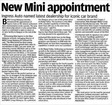The Star - BMW Group Malaysia recently announced the appointment of Ingress Auto as the newest authorised Mini representative in the country. The new Mini dealership which is to be named Mini Ingress is scheduled to open its doors at its new facility in Bangsar at the end of the year. (8 October 2012, Metro, page 20)
