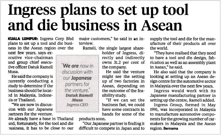 New Straits Times - Ingress Corp Bhd plans to set up a tool and die business in the Asean region over the next few years, says executive vice-chairman and group chief executive officer Datuk Rameli Musa. (25 January 2012, Business Times, page B2)
