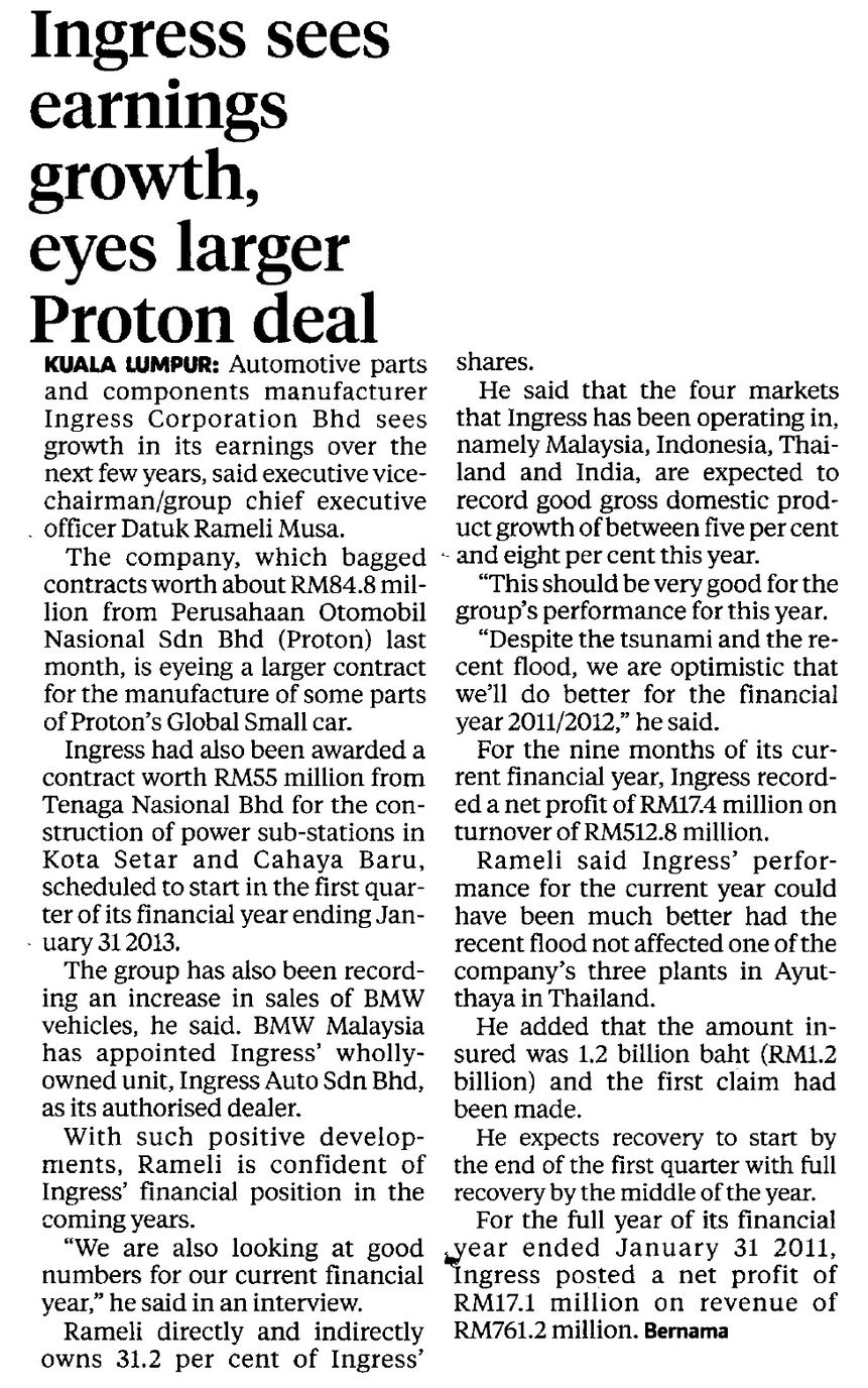 New Straits Times - Automotive parts and components manufacturer Ingress Corporation Bhd sees growth in its earnings over the next few years, said Executive Vice Chairman / Group Chief Executive Office Datuk Rameli Musa. (14 January 2012, Business Times, page I-b16)